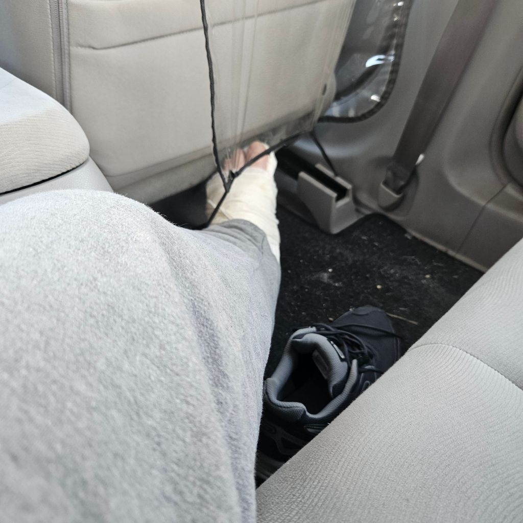Szóval ülés vissza, én ki, irány a kocsi hátsó része. Szépen betettem a tomporomat a hátsó ülésre, a bátyám megfogta a lábam, és lassan bekúsztam az ellenkező oldalon lévő ajtóig. A gipszes láb ment a földre az ülések közé, az egészséges láb fent maradt az ülésen. Sokkal kényelmesebb volt, mint amire először számítottam. Bár a biztonsági öv nem biztos, hogy a legjobb helyen tartotta a testem — de hát ez van.