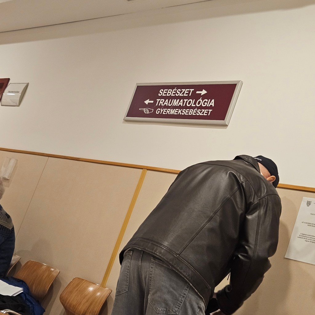 Eddigi karrierem során egyszer jártam a csepeli traumatológián, akkor egy lélek sem volt ott (bár igaz, hogy az munkaidőben volt). Most viszont ennek a szöges ellentéte volt a helyzet: úgy hét ember várakozott előttünk. Ez ugyan nem tűnik soknak, de csepeli időszámításban így is ott ültünk vagy másfél órát, mire sorra kerültünk.